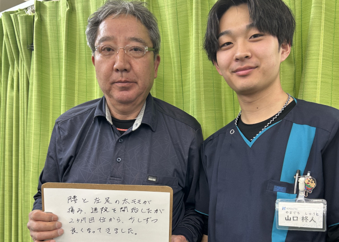 | 症状 | 腰痛、大腿部の痛み |